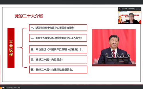 团委学生会轮值主席师健航同学领学党的二十大精神。师健航同学首先概论了二十大报告的内容,带同学们回顾了大会议程以及新时代十年的伟大变革,并强调了党的十八大以来,中国共产党勇于进行理论探索和创新,以新的视野深化对共产党的执政规律集中体现为习近平新时代中国特色社会主义思想,要将十九大以及十九届六中全会提出的思想长期坚持并不断丰富发展。