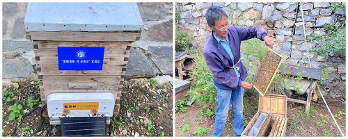 座谈结束后,刘书记带领团队去往养蜂基地,工作人员向队员们展示了“E窝蜂”,并进一步介绍了养蜂的适宜环境和相关内容。“E窝蜂”是由北京农学院的智慧研究院自主研发,由农学院专家亲自指导、配置、安装的智慧蜂箱,采用太阳能供电,使用简便。它的功能极其丰富,例如,可以通过检测蜜蜂的出入量,对它的出勤情况进行分析,确定蜂群是否正常,如果检测的数据发生突然的变量,智慧蜂箱就可以及时的预警。另外,智慧蜂箱自带精锐的称重系统,实时监测采蜜量的变化。最后,团队领养了数箱中华蜂,用于新技术的试验。