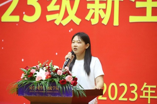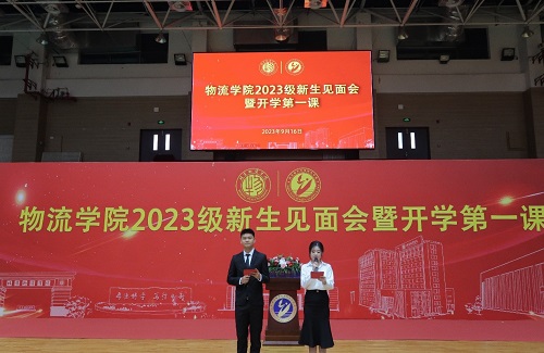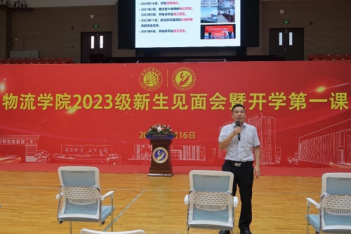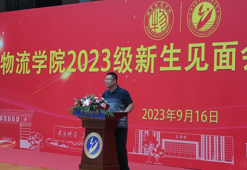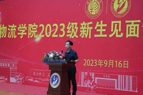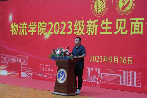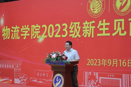 院长姜旭发表讲话。第一,希望同学们饱含敬畏之心,敬畏学术,敬畏专业,敬畏规则,敬畏生命。“敬”是尊重,“畏”是害怕,心存敬畏方能前行,希望同学们传承对学术的敬畏之心,扎实开展学术训练,奠定修身、齐家、治国、平天下的知识基础和思维能力,以思考型的心态去生活,相信学院提供的知识、能力、素养能让同学们受益终身,也希望同学们能够以学术之人格坚守青春之梦想。第二,希望同学们恪守自律。今日之学子身处世界百年未有之大变局,面对无尽的诱惑、躺平的颓废、内卷的焦虑、摆烂的心态,希望涵养自律品德,树立自律意识,追求自律生活,实现自律人生。希望大家不求举世皆醉、唯我独醒,但求大潮来袭时,选择站在理性的一边、文明的一边、人民的一边。第三,希望同学们保持感恩之心。感恩是一种智慧,大家要感恩父母、老师、朋友以及社会,珍惜学院优质的教学和科研资源,如国家级一流本科专业建设点、中国第一家国际采购与供应链联盟认证、与美、德、日等国外大学的学术交流,以及五个企业奖学金机会等,在感恩中前行。最后,姜院长用“你若努力,便是晴天”亲切勉励新生们尽快成长为优秀的物流人,鼓励同学们努力面对挑战、奋力创造未来。