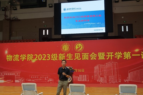 随后,进行新生“励志”教育环节。北京市顺义区统计局党组书记、局长武捷作主旨发言,他首先向同学们讲述了自己校园时光、奋斗历程和职业发展等。随后,向同学们分享了有关物流行业的一系列数据和趋势,强调物流行业增长势头迅猛,前景十分广阔。特别是在疫情期间物流行业成为国家和市场运行的命脉,具有极端重要性。他鼓励学生们积极追求自己的兴趣和梦想,将个人目标与国家的发展目标以及人民对美好生活的向往相结合,为实现自己的梦想而努力奋斗。最后,武书记祝愿新生们在大学生活中都能喜获成功、成长成才,为物流行业的繁荣贡献力量。