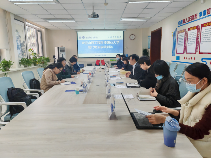 来访一行主要就物流类专业人才培养目标、人才培养模式、人才培养方案、实验室建设、开设课程、使用教材及出版社、学生管理及就业情况、绩效管理等方面进行学习调研。学院芮嘉明副院长对到访嘉宾的相关疑问进行了详细解答,并对下一步双方持续交流合作提出了正式邀请,双方就师资互学、教学互鉴、学生互访相关事宜展开了热烈讨论。