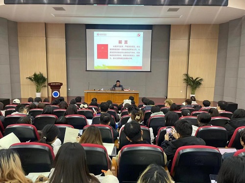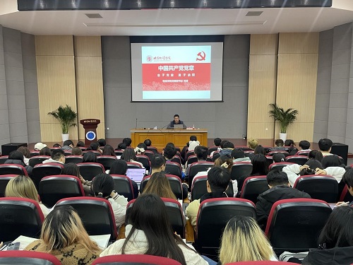 党委副书记孙涛在知新楼二层报告厅为学院分党校入党积极分子培训班全体学员讲授《中国共产党章程-忠于党章、勇于承担》专题党课。