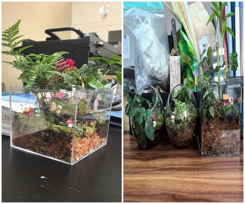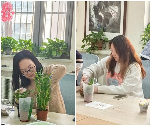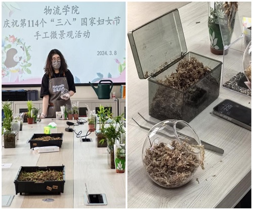 活动由清筑自然微景观的讲师黄老师通过观看视频和人工讲解两种方式为教职工进行现场教学与展示。随后,老师们热情洋溢地跟随黄老师的引导,亲自动手投入到创作中,将普通的空瓶化为了一件件富含苔藓、植物和各种独特装饰的微景观艺术品。每一件作品都流露出老师们通过微妙的景观设计所表达的情感,精巧绝伦且各具特色。