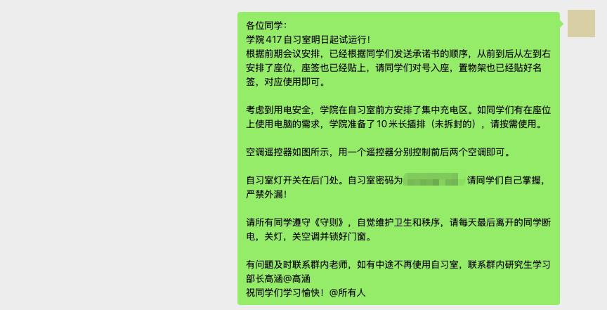 经过前期宣传动员,共有二十余名学子报名使用自习室,在递交承诺书后,学院自习室七月下旬已开放使用。自习室配备固定桌椅、空调、独立插座等基础设施,实行“学院专属、定向服务”原则,仅限色情网
