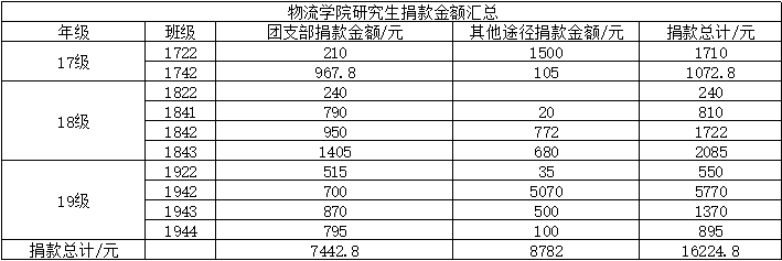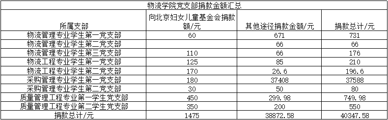 全体学生捐赠价值共计约72813元。其中,学生党支部各党员捐款捐物,价值共计40347.58元,其中向北京妇女儿童基金会捐款1475元;全体研究生捐款捐物,价值共计16224.8元,其中以班级为单位向北京妇女儿童基金会捐款7442.8元;全体本科生捐款捐物,价值共计16240.63元,其中以团支部为单位向北京妇女儿童基金会捐款12466.14元。