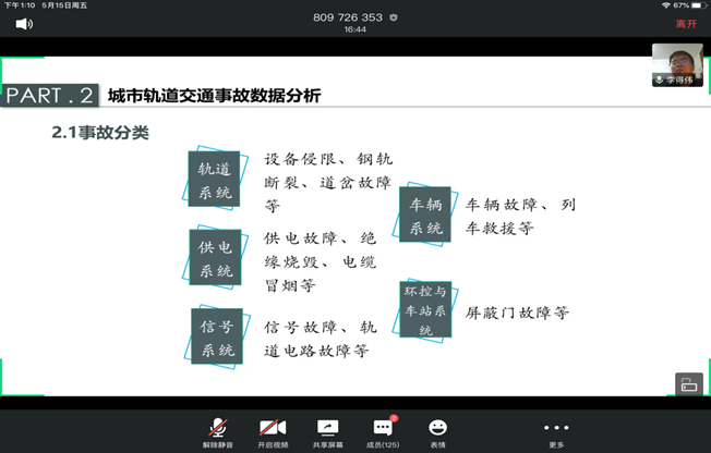 首先,李得伟教授从城市轨道交通的发展情况以及交通事故的影响引入研究问题的背景,然后从不同类别事故对比、客流量与事故关系、事故的时空分布等方面对城市轨道交通事故进行数据分析,并阐述了应急资源配置的影响因素。