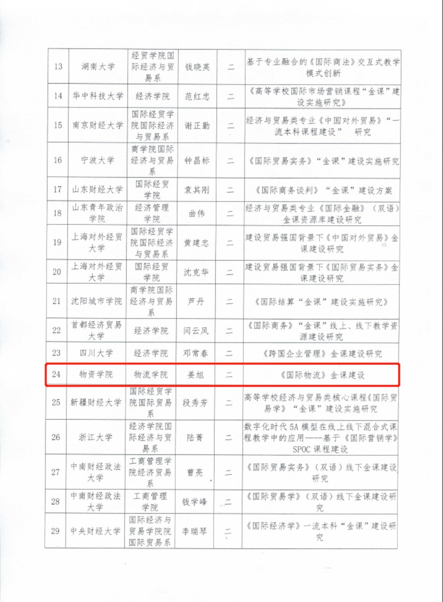 院长姜旭教授牵头组织申报的“《国际物流》金课建设”项目成功入选。此次发布的研究课题是教育部经济与贸易类专业教学指导委员会首批“金课”建设项目,共有来自全国26所本科院校的32个项目入选。