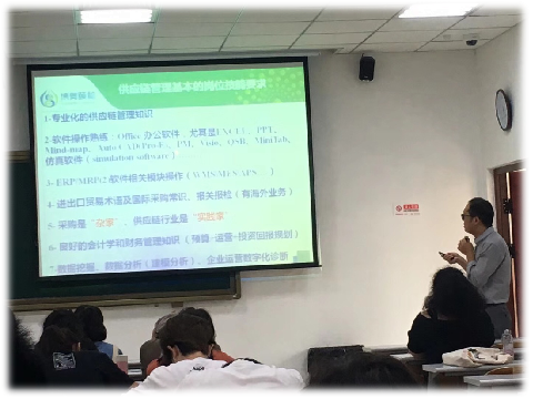 根据课程进度及同学们专业知识掌握的程度,结合当期的经济热点,每位讲师都首先对其所在领域的基本情况、行业发展优势及行业领先技术进行了细致的介绍,让同学们眼界大开。然后详细介绍他们所在企业的业务及发展,其中侧重于企业在人才的专业素质方面的期望与要求,引导我们积极分析自身竞争优势,理论联系实际,对未来企业面试和职业规划指明了方向。