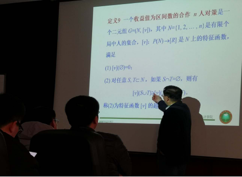 然后,张强教授又引入模糊联盟、收益值为模糊数、以及收益值为区间数的对策,并且介绍了区间数的概念和运算。张强教授的讲解深入浅出,从自己的科研成果中,分析如何研究模糊合作的问题,并通过一些通俗易懂的案例使师生对博弈论有了全面的认识,也使广大师生对模糊合作有了更深的了解。