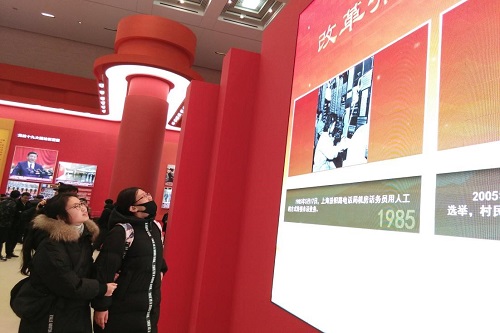 进入到大厅之后,同学们进行自由参观,在一张张珍贵照片、一段段历史视频、一件件文献展品前驻足观看,并且认真进行讨论交流,切身感受着改革开放40年来我们国家取得的举世瞩目的发展成就,以及人民生活发生的翻天覆地的变化,感受着中国共产党、中国人民和中国特色社会主义的伟大力量。