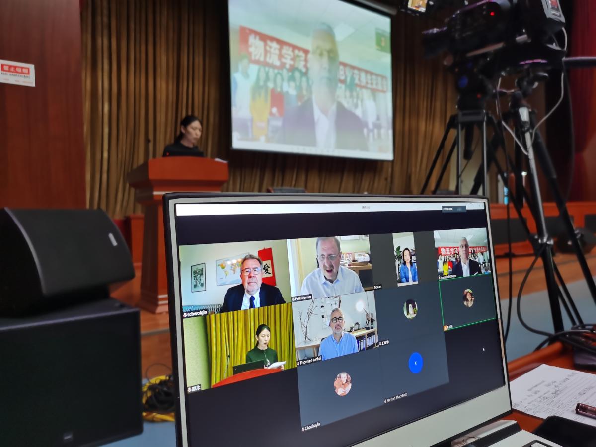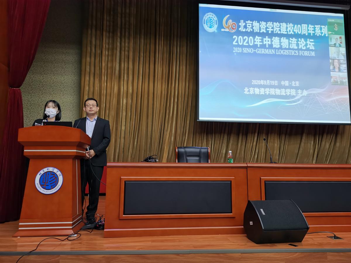 在崇德楼一层报告厅举行校庆系列活动——2020年中德物流论坛。此次论坛首次采用线上(腾讯会议)演讲加线下参会(听讲、提问)模式。学院前期投入大量精力进行精心准备,确保了会议的顺畅进行。线上特别邀请了德国巴登符腾堡合作州立大学(Baden-Wuerttemberg Cooperative State University, Loerrach)贝尔(Frank O. Bayer)教授、德国巴登符腾堡合作州立大学(Baden-Wuerttemberg Cooperative State University, Loerrach)阿明(Armin F. Schwolgin)教授、德国维尔茨堡-施维因福特应用科技大学(University of Applied Sciences Würzburg- Schweinfurt)布莱默(Perk Bremer)教授、德国维尔茨堡-施维因福特应用科技大学(University of Applied Sciences Würzburg- Schweinfurt)卡森(Karsen Machholz)教授、西克德国公司(Sick AG, Waldkirch)客户需求部副总托马斯(Thomas Henkel)先生以及天津睿博龙物流股份有限公司创始人、董事长王俊静(Jean Wang)博士担任线上演讲嘉宾。北京物资学院国际合作与交流处处长韩星、色情网