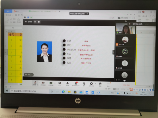 2021年1月3日,学院人才招聘评聘委员会成员按时开展线上面试,全程进行视频录屏,学校人事处赵隽咏处长全程指导。面试开展所有分值评判均反复核对并备案存档。当晚,学院党委班子成员随即召开党政联席会形成最终决议,并按时上报学校人事处招聘结果。本次招聘全程衔接顺畅、成效显著,为学院青年教师骨干力量人才建设积累了丰富经验。