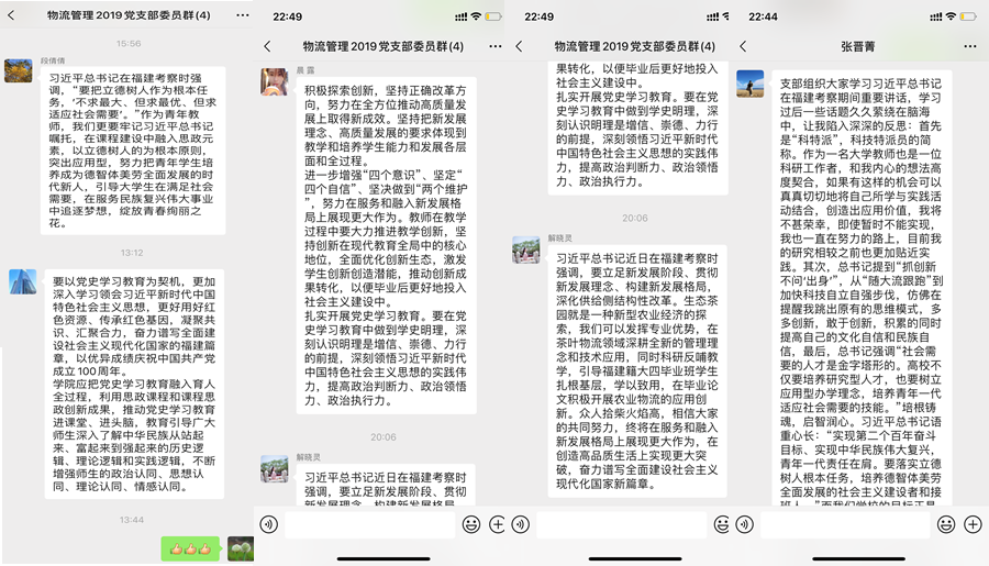 物流管理专业教工与学生第一、二、三党支部组织专业教工党员和学生党员通过自主学习,线上讨论的方式开展。活动期间,教师党员梳理了前期学习强国平台的学习资料,并结合此次活动的专题内容进行了认真细致的学习,通过微信平台分享了此次学习的心得体会。物流管理专业学生第一、二、三党支部组织学生党员进行线上集中分享,学生党员在学习后表示,“习近平总书记在福建考察的讲话精神,为我们深入学习贯彻习近平新时代中国特色社会主义思想提供了独特资源、生动教材。我们要带着特殊感情、特殊责任,持续深入学习采访实录,深刻感悟总书记的深邃思想、前瞻理念、民本情怀、务实作风,进一步提高学生党员政治站位,践行初心使命,提升素质本领,努力把学习成果转化为推动工作的思路举措。我们学生党员要牢记自己入党时的誓言,学习最新精神,发扬党员先锋模范作用。”