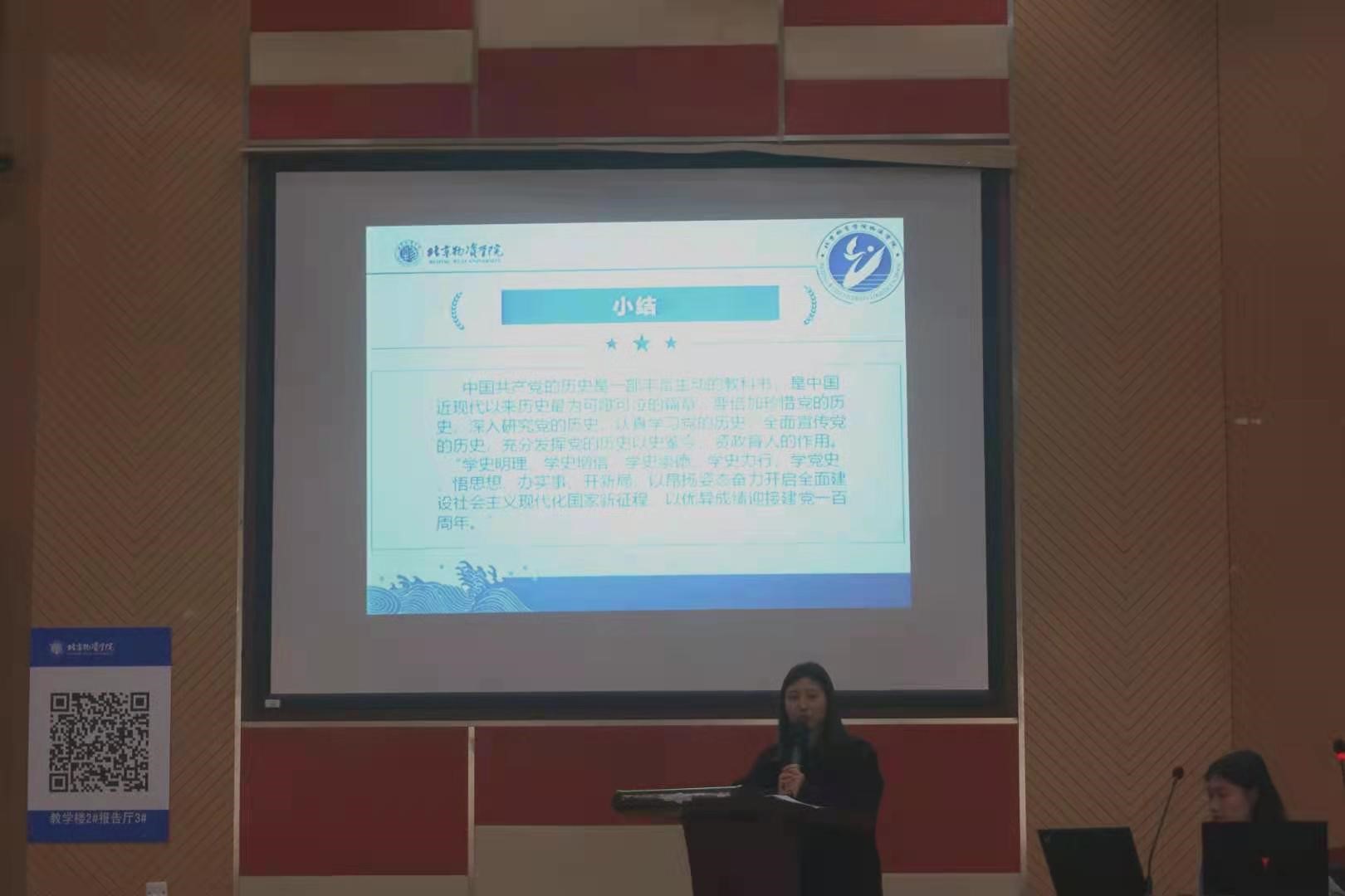 大会在悠扬的共青团团歌中拉开了帷幕,全体成员合唱团歌,铿锵激昂。接着,分团委书记李思奇老师从“为什么学习党史”、“怎么学习党史”两大方面讲述学习党史的重要意义并动员大家积极参与党史学习之中。关于“为什么学习党史”,李思奇老师从“三个必然要求”的方面,讲解“开展党史学习教育是牢记初心使命、推进中华民族伟大复兴历史伟业的必然要求;是坚定信仰信念、在新时代坚持和发展中国特色社会主义的必然要求;是推进党的自我革命、永葆党的生机活力的必然要求。”关于“怎么学习党史”,李思奇老师解读 “六个进一步”的根本内容,希望大家可以不断总结党的历史经验,不断提高应对风险挑战的能力水平,不断增强用党的创新理论武装自己的政治自觉。