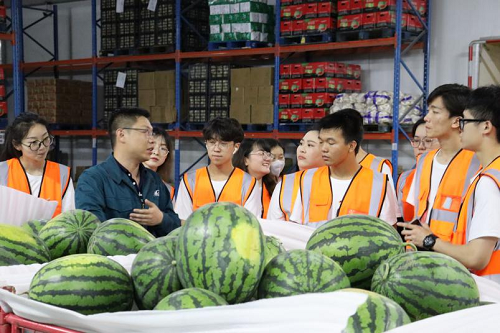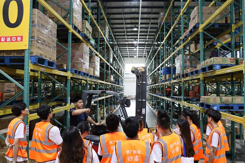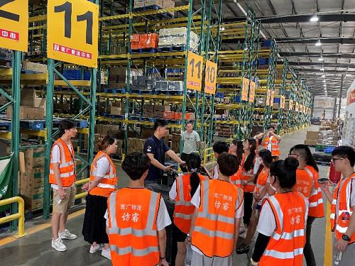 到达目的地后,实践团受到了公司领导和员工热情的欢迎。总经理助理于文超经理带领实践团参观公司布局,对企业的仓储管理方式、设备的规范使用和人员的任务分配等多种仓储相关知识进行讲解,接着介绍了分拣员的工作流程以及常温仓设备的工作原理及补货方法。参观的过程中,让实践团印象深刻的是该公司将人员分批在指定区域进行作业,同时让每个员工达到一岗多能的标准,这样既可以提升员工的工作积极性,又可以在人手不足时照常完成工作,优化人员安排,提高工作效率。