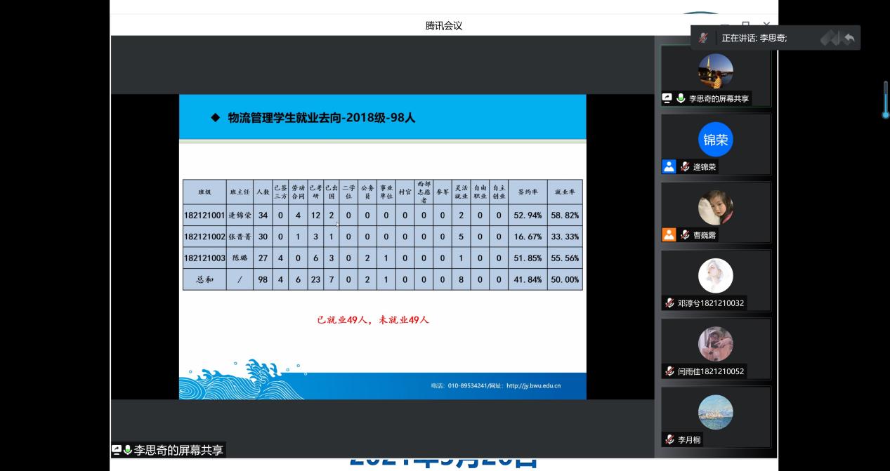 物流管理专业面向2022届毕业生及家长通过腾讯会议召开毕业生就业促进工作会议,会议由物流管理专业教工党支部书记逄锦荣主持。参会嘉宾有物流管理系主任温卫娟、分团委书记李思奇,班主任张晋菁、陈璐。