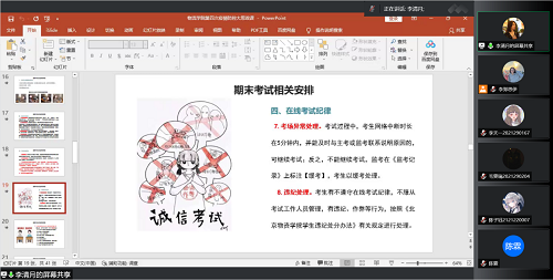 随后,在期末考试临近之际,为树立诚信考试精神,营造良好的考试氛围,李清月老师就期末考试的相关安排和要求进行简要介绍,他号召全体学生干部、学生党员发挥模范表率作用,考试前认真投入期末复习,提前按需调试考试设备,严于律己。其中,李清月老师重点强调了“诚信考试”的重要性,以考试作弊引发的一系列问题和考试违纪的警示案例为索引,要求各位同学明确“诚信考试”主题教育大会的内容和要求,严格遵循考试制度,严禁舞弊行为,希望同学们明确自己作为一名学生的角色定位,以端正的态度积极对待学习,用实际行动营造良好的学风和考风,以正确的考试行为铸就诚信品格。此次诚信教育促进了学生正确认知、自觉诚信品质的养成,进一步提高了大学生言行一致、履约重诺、恪守诚信的思想自觉和行动自觉。积极做到“树道德之风范,立诚信之根基”。