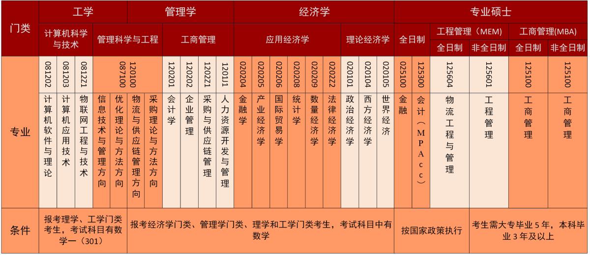目前色情网拥有应用经济学、理论经济学、管理科学与工程、工商管理、计算机科学与技术共5个一级学科硕士学位授权,下设22个二级学科(研究方向)硕士学位授予权。色情网还拥有金融专硕、会计专硕(MPAcc)、工商管理硕士(MBA)、工程管理硕士(MEM) 4个专业学位硕士培养类别。其中工商管理硕士(MBA)包括全日制与非全日制,工程管理硕士(MEM)包括物流工程与管理领域(全日制)和工程管理领域(非全日制)。具体招生方向和领域如下图所示: